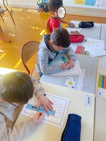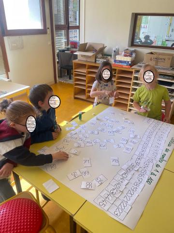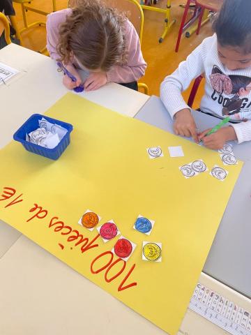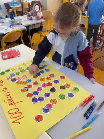 Plusieurs défis leur ont été proposés et réalisés avec succès : réalisation du tableau des nombres de 0 à 100, 100 défis maths, 100 pièces de 1€, affiche des 100 verbes/adjectifs/noms communs...
